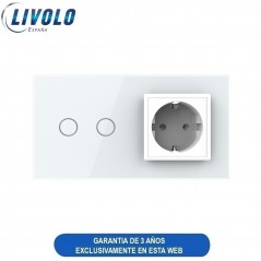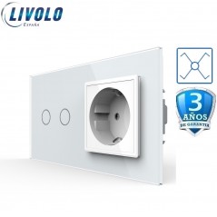 Cruzamiento Conmutador Doble TACTIL + 1 TOMA Enchufe Tomacorriente marca Livolo con panel de cristal EU Standard color BLANCO